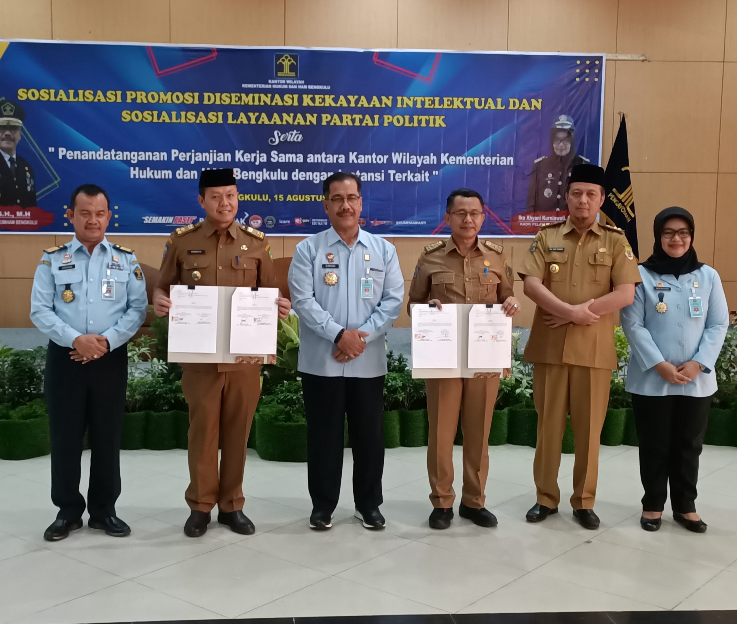 Bengkulu, Kawalnews.com – Kemenkumham Bengkulu melalui Divisi Pelayanan Hukum dan HAM menggelar sosialisasi promosi diseminasi kekayaan intelektual (KI) dan sosialisasi layanan partai politik, Senin (15/8) di Hotel Grage Horizon. Dihadiri Kepala Kemenkumham Bengkulu Erfan, MH, didampingi Kepala Divisi Administrasi Johan Manurung dan Kepala Divisi Pelayanan hukum dan HAM Ika Ahyani Kurniawati. Selain itu dihadiri oleh jajaran instansi terkait, Pejabat Provinsi, Pejabat Kota dan beberapa peserta undangan sosialisasi dari KPU dan Partai setempat.