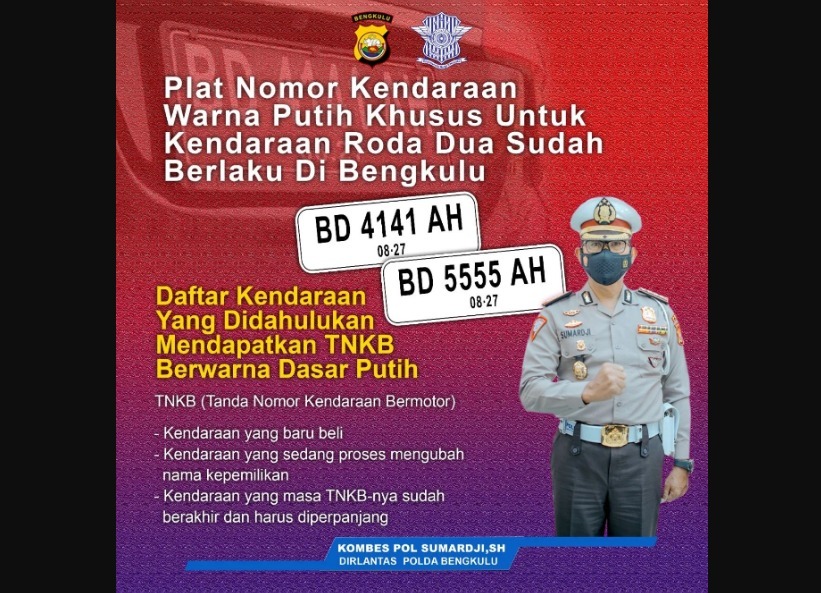 Kabid Humas Polda Bengkulu Kombespol. Sudarno, S.Sos, MH membenarkan informasi yang telah beredar di masyarakat tersebut. Ia menjelaskan aturan penerbitan TNKB warna putih ini mengacu pada peraturan Polri Nomor 7 tahun 2021 tentang Registrasi dan Identifikasi Kendaraan Bermotor.Tertuan dalam pasal 45 ayat 1 huruf a, bahwa plat nomor untuk kendaraan bermotor perseorangan, badan hukum, Perwakilan Negara Asing (PNA), dan Badan Internasional akan berubah menjadi warna putih dengan tulisan hitam.