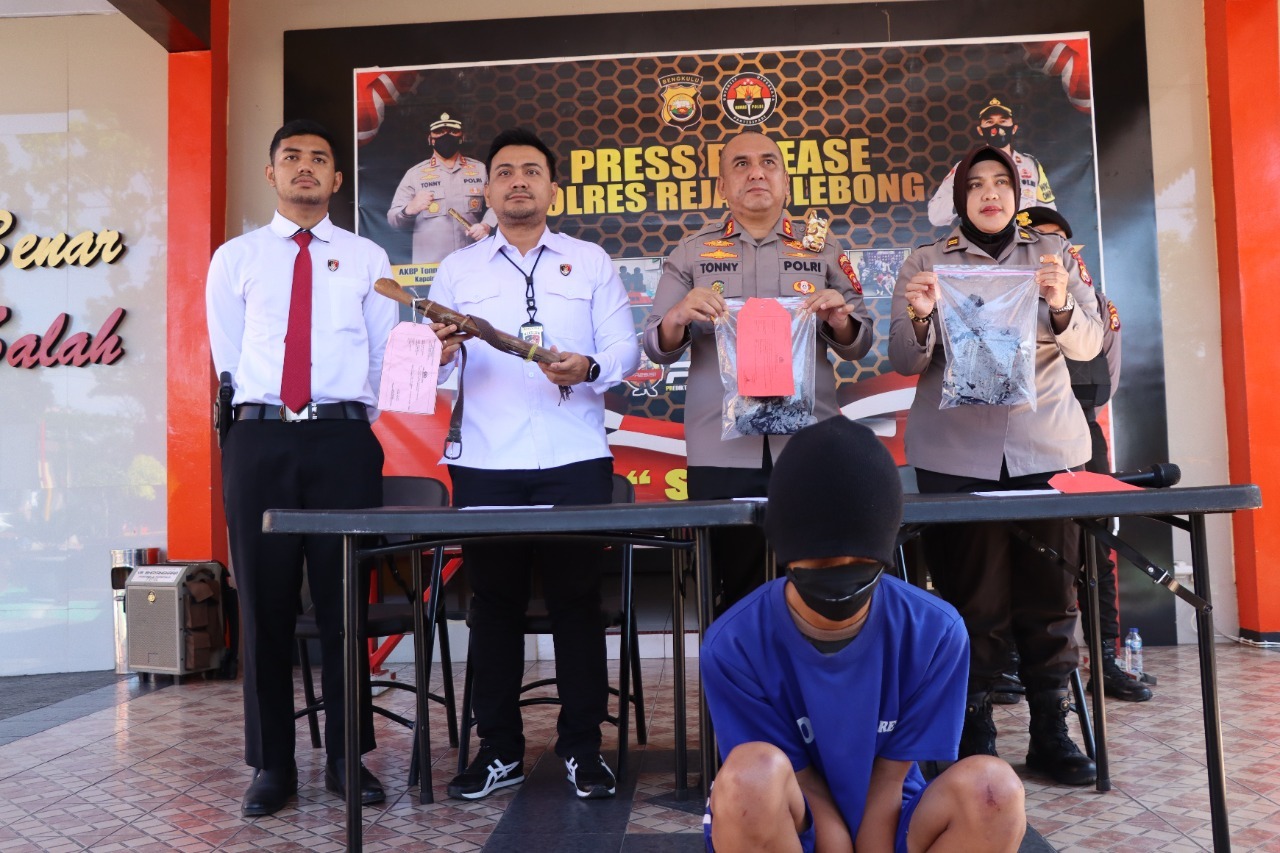 “Terduga pelaku AS diamankan bersama barang bukti 1 lembar aju berwarna hitam yang terdapat bercak darah, 1 lembar celana pendek dan sebilah senjata tajam sepanjang 47 CM dengan gagang kayu warna coklat,” terang Kapolres Rejang Lebong AKBP Tonny Kurniawan, didampingi Kasat Reskrim AKP Samson Sosa Hutapea dan Kasi Humas Iptu Bertha Ginting saat press release di Mapolres Rejang Lebong, Senin (26/9/2022).