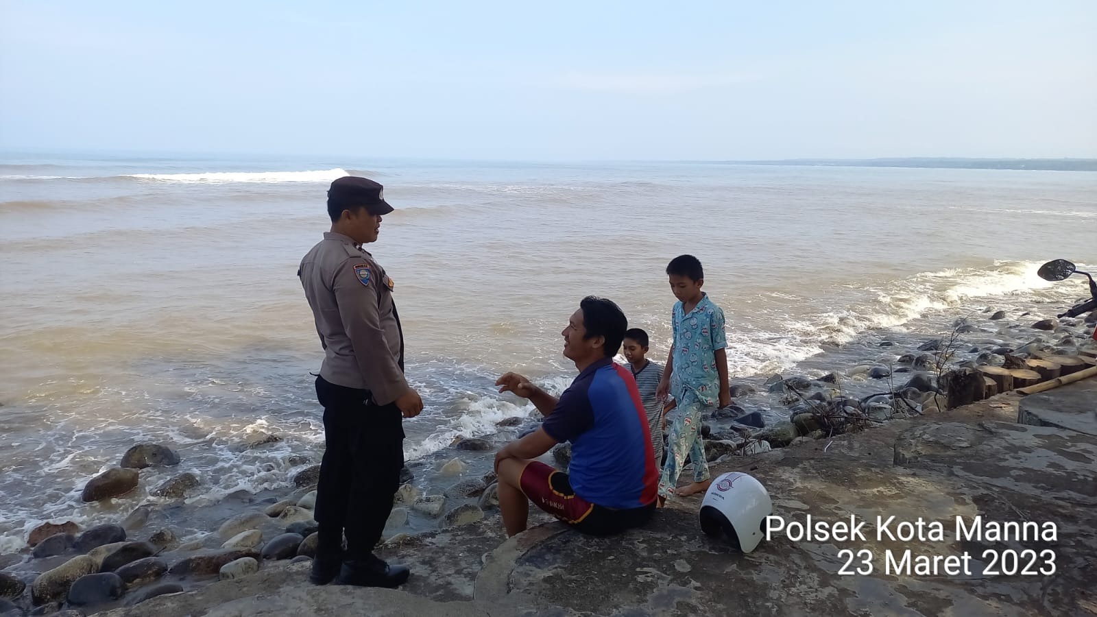 Bengkulu Selatan,-Dalam rangka mendekatkan diri kepada masyarakat dan senantiasa memantau serta monitoring di berbagai lokasi wisata Bhabinkamtibmas Polsek Kota Manna Polres Bengkulu Selatan Polda Bengkulu, Aipda Istin Farizon, S.H dan Briptu Ahmad Rizieq Arbasera memberikan imbauan kepada pengunjung Pantai Pasar Bawah Manna Bengkulu Selatan, Rabu (22/3/2023)siang.