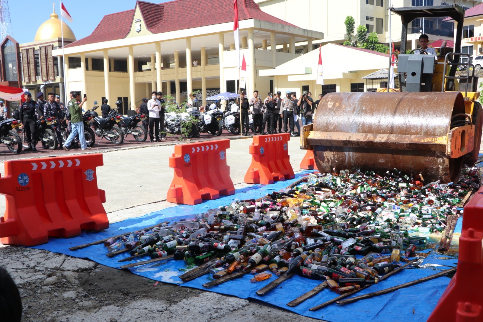 ”Jadi total BB miras yang kami musnahkan hari ini berjumlah 1.736 botol berbagai jenis dan tuak sebanyak 55 liter,” ungkap Kapolda Bengkulu usai memusnahkan barang bukti.