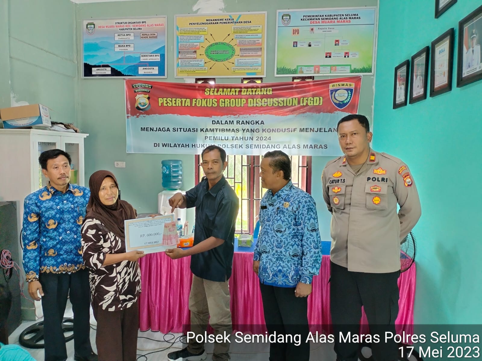 Seluma – Pada hari Rabu (17/05/2023), Kapolsek Semidang Alas Maras Iptu Catur Teguh Susanto. S.H., menghadiri pembagian/penyaluran BLT – DD di Balai Desa Muara Maras Kecamatan Semidang Alas Maras Kabupaten Seluma.