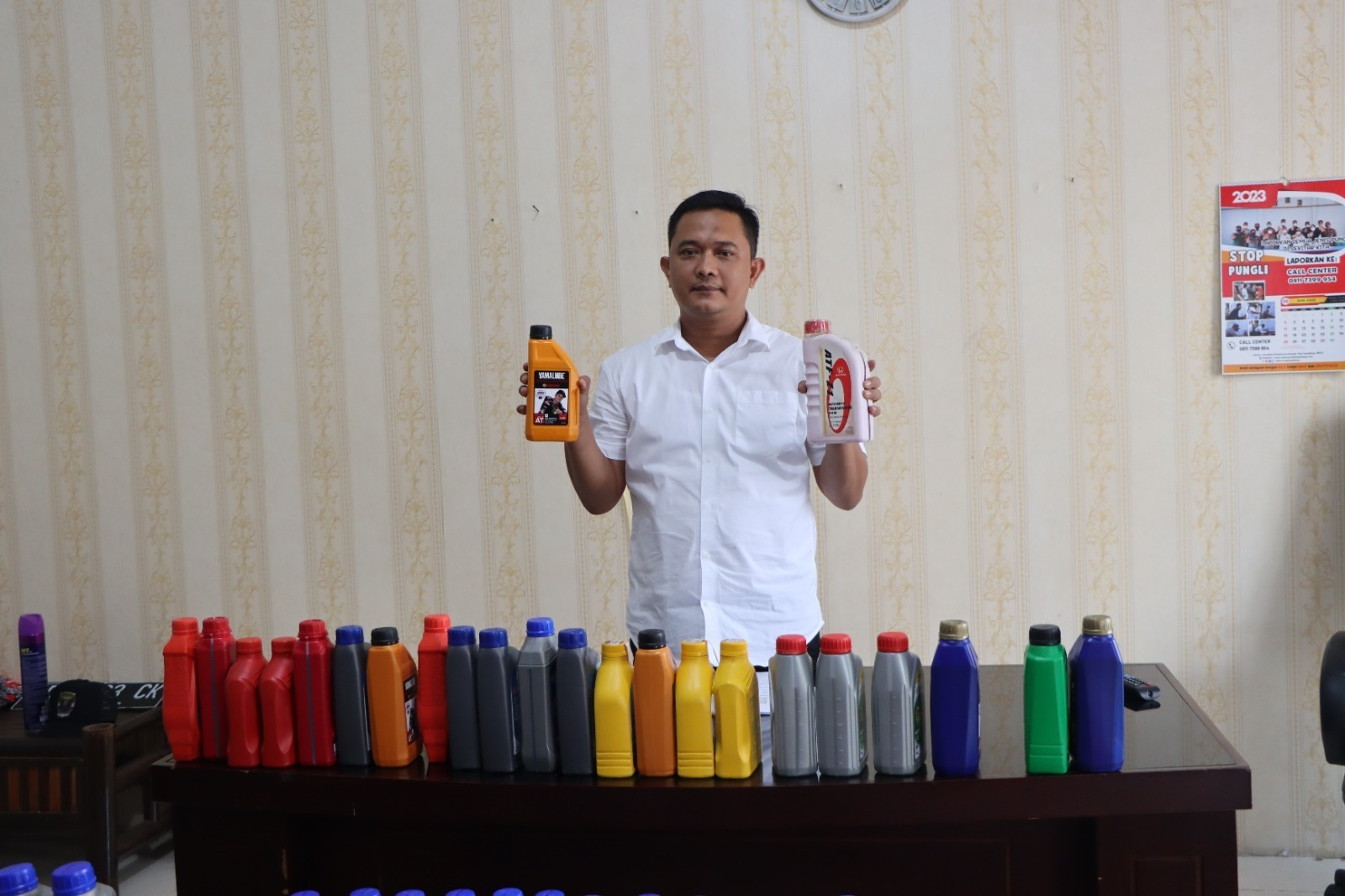 Kedua pria ini diamankan bersama dengan ribuan oli diduga palsu dari berbagai jenis dan merek.