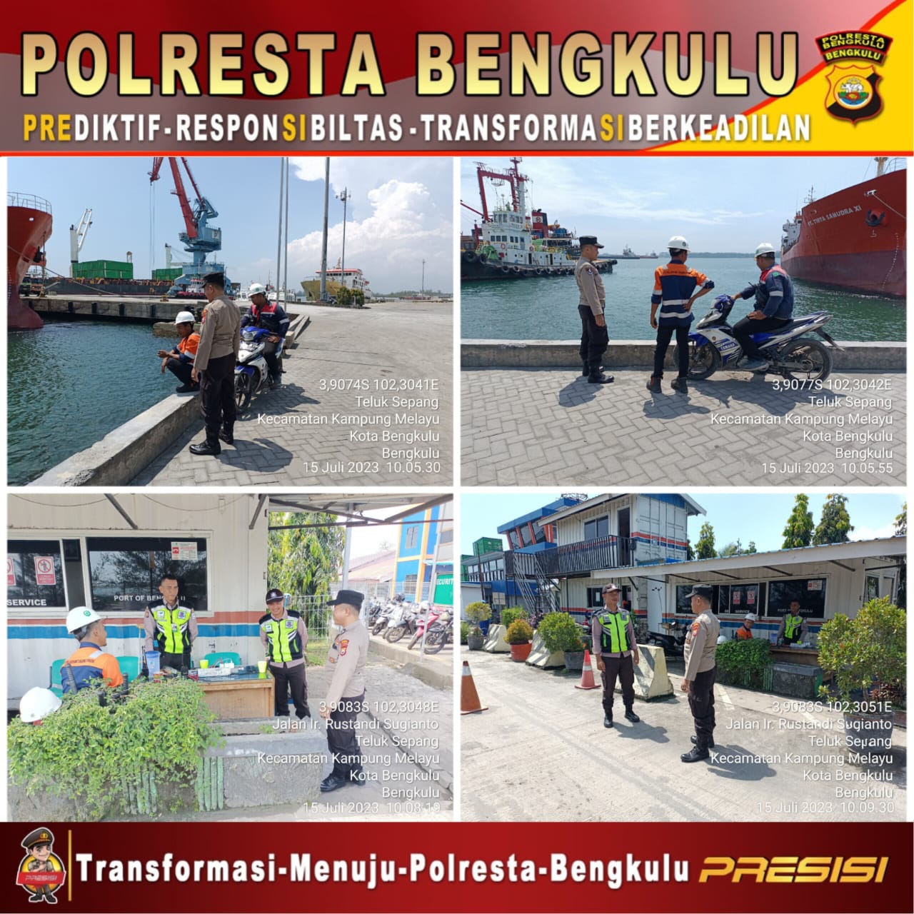 Bengkulu – Polsek KSKP Pulau Baai Polresta Bengkulu Melaksanaan Giat Patroli di kawasan Pelabuhan Pulau Baai Bengkulu guna mencegah tindak pidana 4C dan memberikan rasa aman kepada warga masyarakat di wilayah hukum Polsek KSKP Pulau Baai, Sabtu 15 Juli 2023.