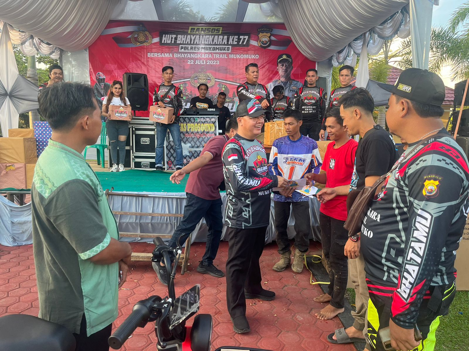 Mukomuko – Masih dalam rangkaian Hari Bhayangkara Ke-77, Polres Mukomuko bersama Bhayangkara Trail Mukomuko melaksanakan kegiatan bertajuk “Bansos HUT Bhayangkara ke-77 Polres Mukomuko bersama Bhayangkara Trail Mukomuko”, Sabtu (22/7/2023).