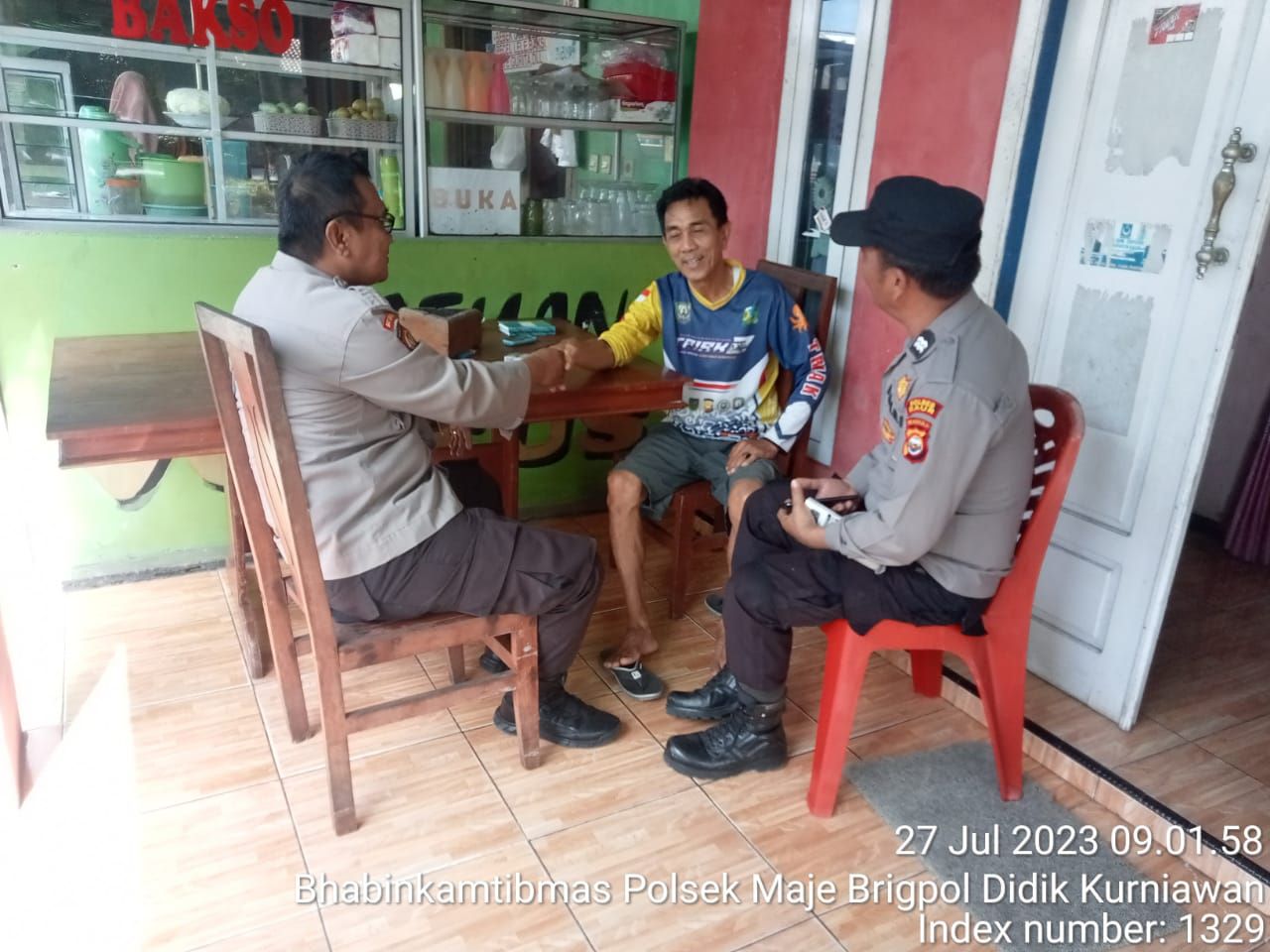 Kaur – Personel Polsek Maje Polres Kaur Polda Bengkulu, Aiptu Leza Hariyanto, Aiptu Y.A. Zega, Brigpol Didik Kurniawan, dan Brigpol Nurhan Pansori melaksanakan sambang Harkamtibmas kepada tokoh masayrakat (Tomas) di Desa Benteng Harapan Kecamatan Maje Kabupaten Kaur, Kamis (27/07/2023).
