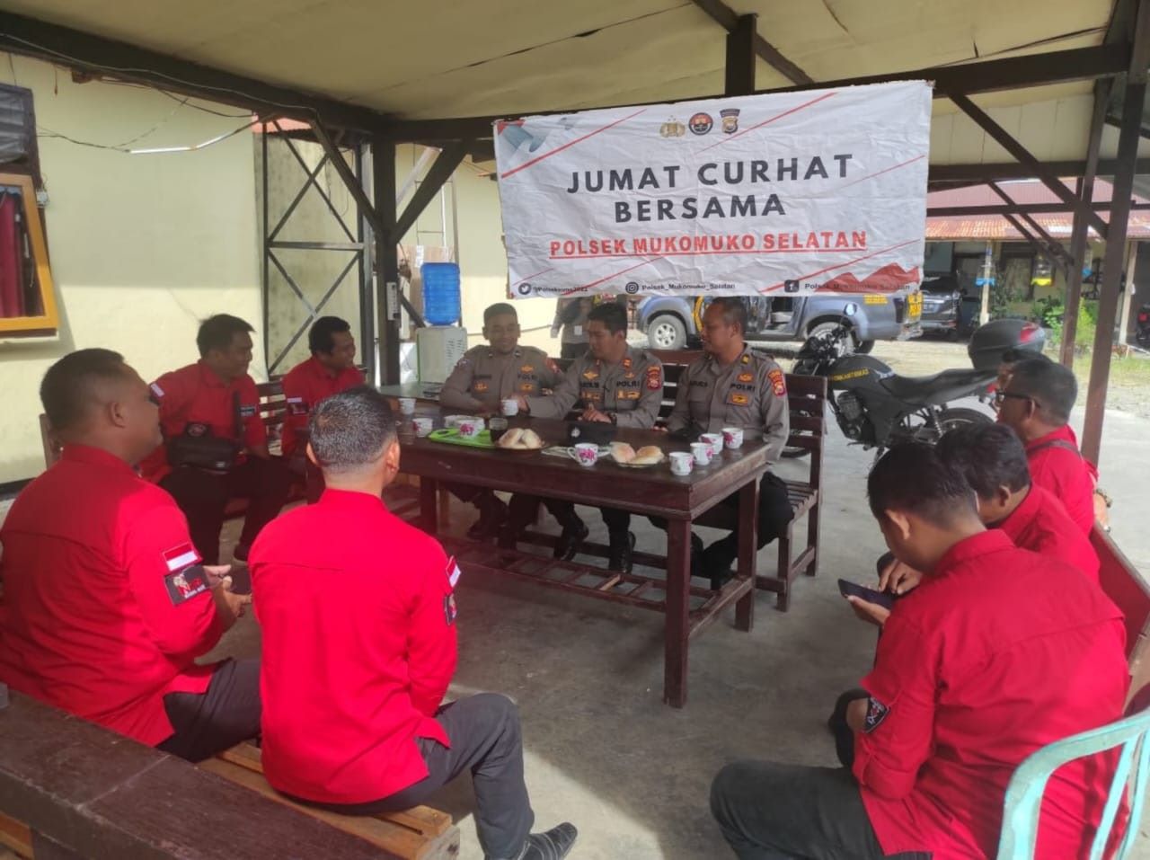 Mukomuko – Polsek Mukomuko Selatan Polres Mukomuko Polda Bengkulu, melaksanakan kegiatan Jumat Curhat yang memungkinkan masyarakat menyampaikan secara langsung terkait keluhannya kepada polisi dan diterima langsung oleh Kapolsek Mukomuko Selatan IPTU M. Setya Yuli Muhanto, S.H., di Desa Medan Jaya Kecamatan Ipuh Kabupaten Mukomuko, Bengkulu, Jumat (04/08/2023) pagi.