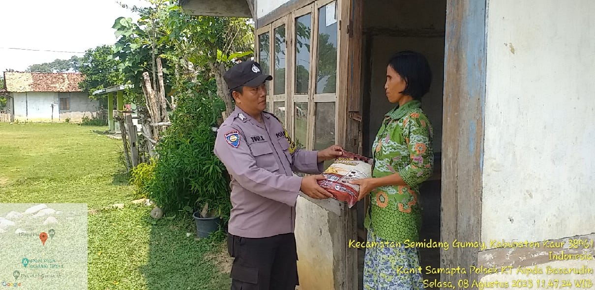 Aipda Basarudin, Bripka Yogi Ekson Memberikan bantuan sembako berupa Beras 5 Kg dari Polsek Kaur Tengah Kepada Masyarakat Yang kurang mampu kepada lansia berumur 46 yakni Zaitun asal Desa Gunung Tiga II Kec. Semidang Gumay Kab Kaur.