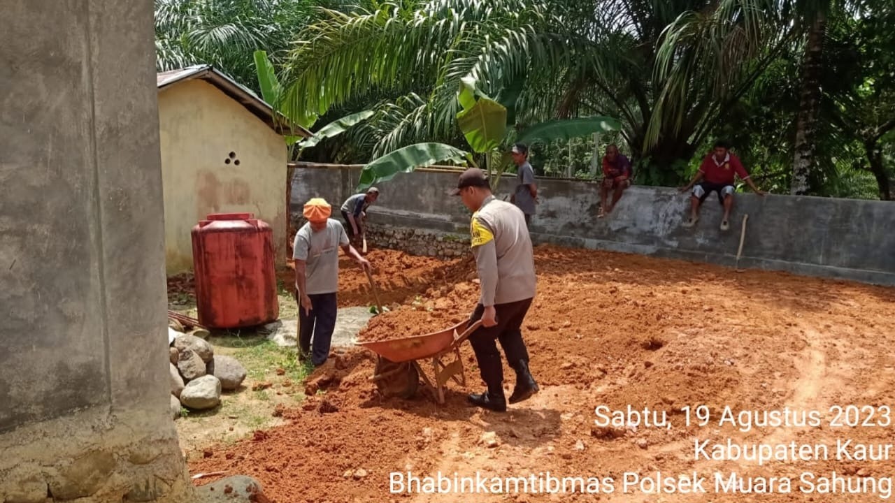 Kaur – Bhabinkamtibmas Polsek Muara Sahung Polres Kaur Polda Bengkulu, gotong royong di Masjid Al-Hidayah Desa Tri Tunggal Bakti Kecamatan Muara Sahung Kabupaten kaur, Sabtu, (19/08/2023) sekira pukul 09.00 WIB.
