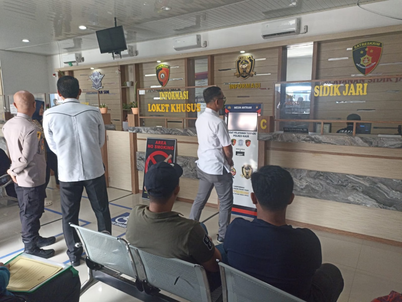 Disampaikan Kapolres Kaur AKBP Eko Budiman melalui Waka Polres Kaur Enggarsah Alimbaldi Tim UPP Provinsi Bengkulu melasanakan sidak pertama kali ke ruangan pelayanan pembuatan SIM dan SKCK dan melanjutkan kunjungan kerja ke ruangan Plt. Bupati Kaur Herlian Muchrim, ST.