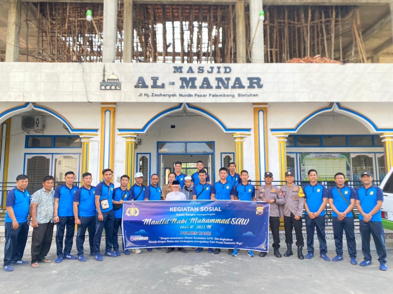 Kaur – Dalam Rangka Memperingati Maulid Nabi 1445 H, Polres Kaur Polda Bengkulu, melaksanakan kegiatan sosial kebersihan lingkungan di Masjid Al – Manar Desa Air Dingin Kecamatan Kaur Selatan, Senin, (25/09/2023), Sekira pukul 08.00 Wib s/d Selesai.