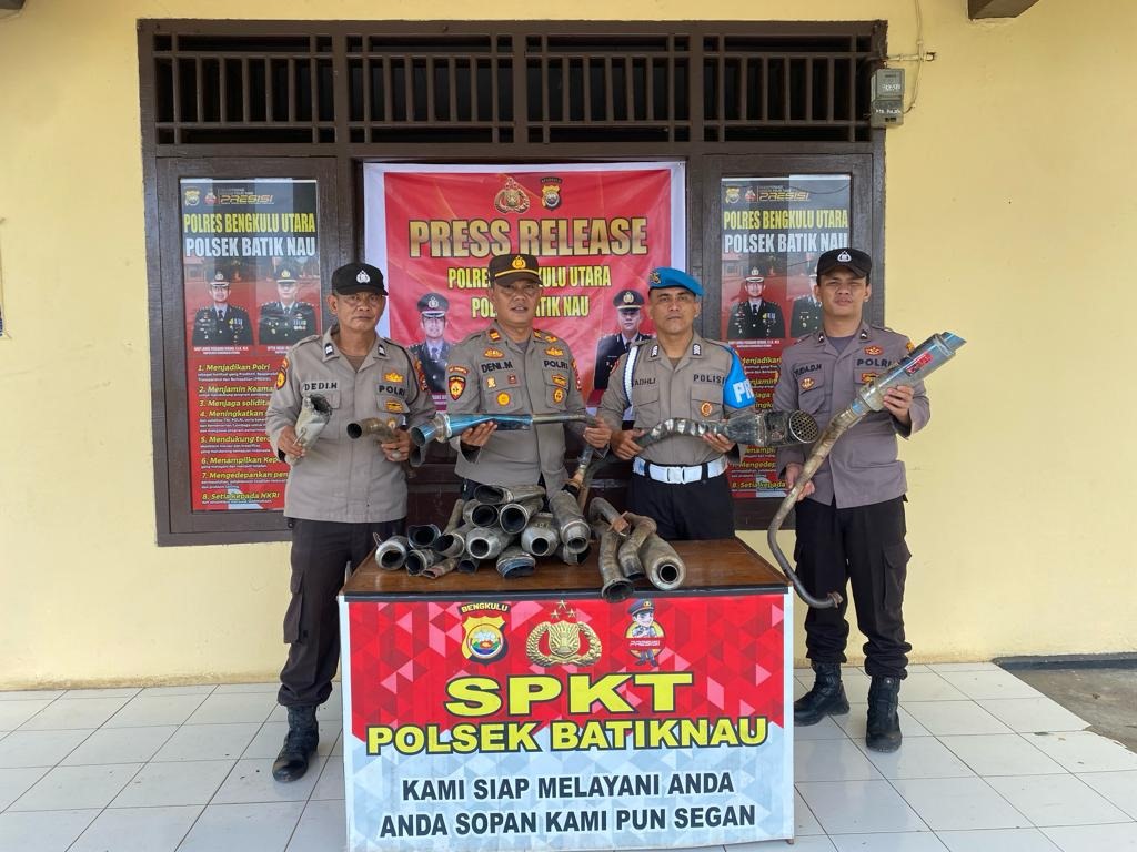 Bengkulu Utara – Kepolisian Sektor Batik Nau melakukan aksi tegas dengan menyita puluhan knalpot tidak standar atau yang dikenal sebagai knalpot brong. Aksi tersebut dilakukan pada kegiatan Press Release yang di gelar pada hari Rabu pagi, (07/2/24), di depan Mako Polsek Batik Nau.